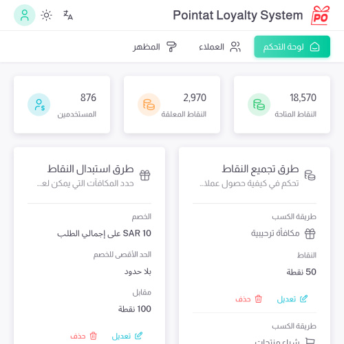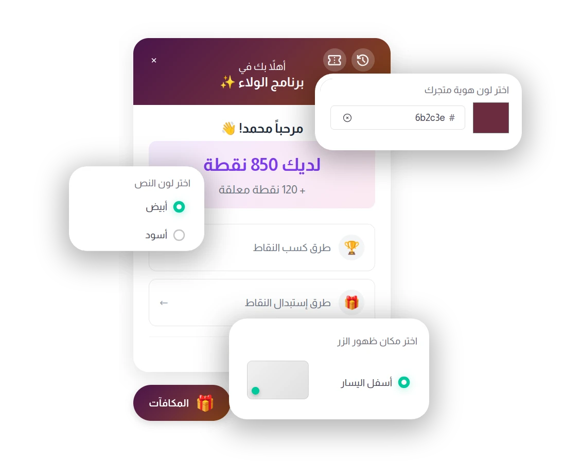 نظام ولاء رقمي يُتيح لعملائك جمع نقاط من خلال عمليات الشراء وغيرها من الأنشطة مثل تقييم المتجر، إكمال الملف الشخصي، أو مشاركة رابط المتجر. يتم بعد ذلك استبدال النقاط بمكافآت قابلة للتخصيص من قبلك.